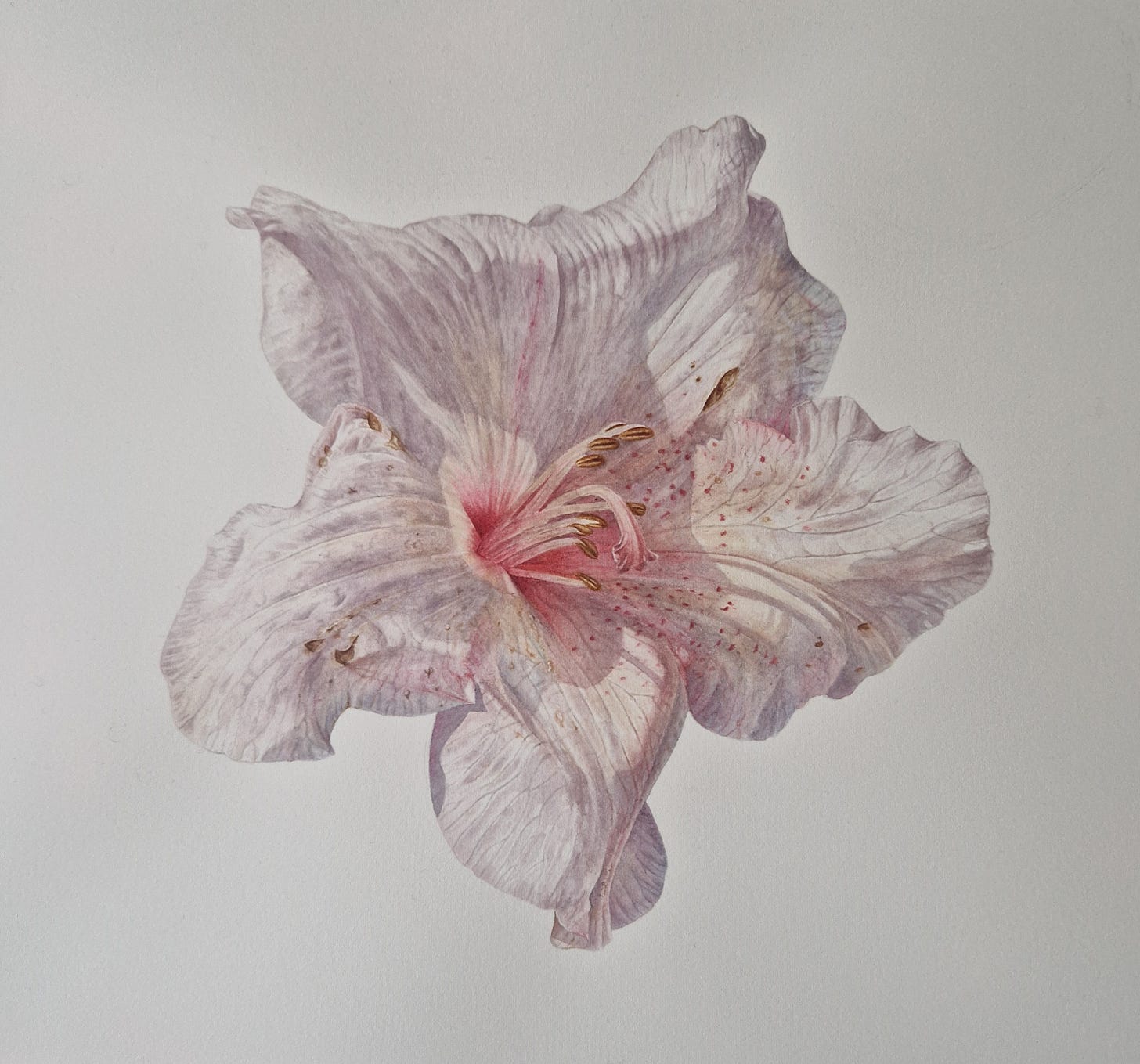 My newest piece is, ‘The Gift. This small painting is only 25 x 25cm but she holds so much quiet emotion. The story goes that one morning I found a single Rhododendron flower sitting on a bench in the garden. It was perfectly fresh but with no sign of how it arrived at its final destination it was as if it had been left as a gift by some unseen hand. At the time I was going through the turmoil of our flooded home, and the simple presence of a beautiful bloom waiting in the sunshine was enough to get me through that day.